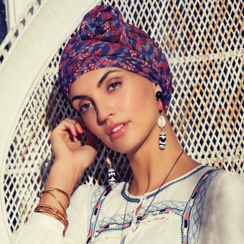 This fabulous and ultra-gorgeous design is perfect for Spring/Summer. The Boho Summer Nights Turban features a beautiful pattern with navy blue and red tones running throughout. The silky-looking fabric creates a sophisticated and elegant look to the turban.